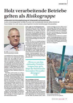 Laut Statistik ist die Gefahr eines Brandschadens in einem holzverarbeitenden Betrieb relativ hoch. Dies schlägt sich beim Abschluss einer Versicherung in hohen Prämien und schlechten Konditionen nieder. Tritt dann tatsächlich ein Schaden auf, können langwierige Auseinandersetzungen mit der Versicherung über die Höhe und Ausbezahlung der Entschädigungen die Existenz gefährden. Deshalb setzen zahlreiche Holzverarbeiter in ganz Österreich in Sachen Versicherung auf einen erfahrenen Kenner der Branche. Max Riffler weiß Bescheid, wo es Einsparungs- und Verbesserungspotenziale gibt. Im Auftrag seiner Kunden verhandelt er klar formulierte Versicherungsverträge, die genau auf die individuelle Risikosituation abgestimmt sind, und schafft so klare Verhältnisse im Schadensfall. Die von der Riffler® Unternehmensberatung Ges.m.b.H. favorisierten „Allrisk-Deckungen” bieten gerade den Holzverarbeitern große Vorteile. Und im Schadensfall haben Sie einen verlässlichen Partner an Ihrer Seite, der den Schaden in Ihrem Sinne raschest möglich abwickelt. Spezielle Vereinbarungen und Rahmenverträge mit österreichischen Versicherern garantieren nicht nur spezielle Leistungen im Versicherungsfall, sondern auch preiswerte und überschaubare Kosten.